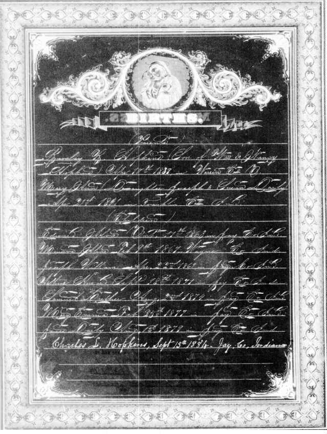 The following is the record of the births in the Barclay Hopkins family, as taken from their family Bible births page (shown in miniature below). I've scanned this page and included it as a large (91k bytes) image that can be viewed or downloaded.