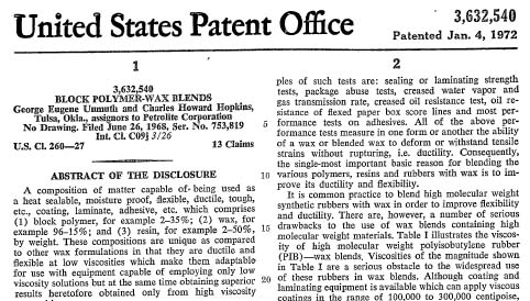 P 3,632,540 Block Polymer-Wax Blends (4 Jan 1972, Petrolite Corp.)