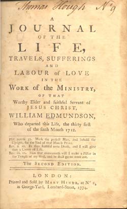 Note: These are excerpts from the Journal of William Edmundson, chosen to show the parentage, marriages, children, and death of this Quaker evangelist. See the note at the end of the page regarding Mary Hinde, the printer & publisher.