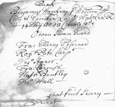 This is the certificate giving Benjamin Hopkins membership in the Vintners Company (London Metropolitan Archive, Ref No COL/CHD/FR/02/0212-0217). It was dated 14 May 1705, and signed by Robert Pate, carpenter, who was a friend of William Hopkins and mentioned in his will. William died on 16 July 1705. Benjamin was admitted to the Vintners by Patrimony, rather than apprenticship, because his father was a member. The date of his freedom admission is 2 Oct 1705. (City Freedom Admission Papers Index, 1701-1713).