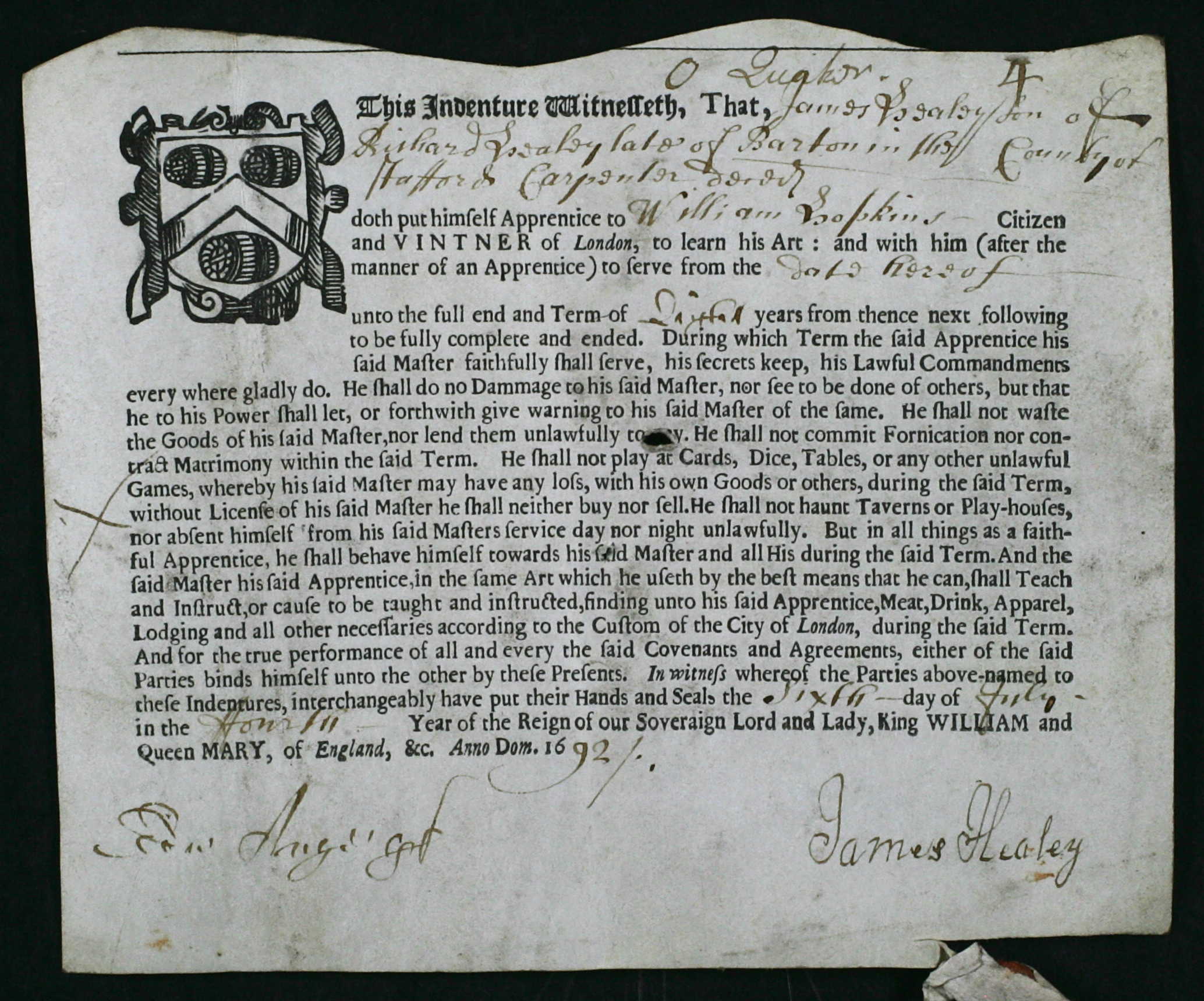 This is the certificate for the apprenticship of William Hopkins the younger to his father, William Hopkins the elder, in the Vintners Company of London. It is the original document, and is signed by William (the apprentice). The date of the certificate is 3 Nov 1686, when William the younger would have been sixteen, a typical age for an apprenticship to begin. William the younger was given the freedom of the city in June 1695 (City Freedom Admission Papers Index, 1681-1700).