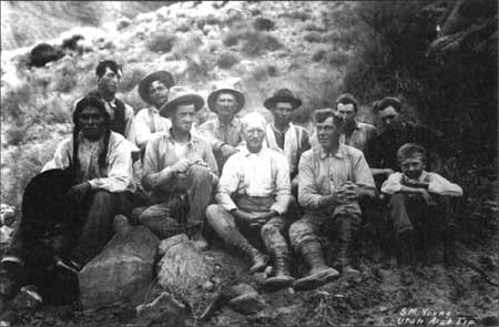 Expedition party seated below Rainbow Bridge, August 13, 1909. Back row, left to right: John English, Dan Perkins, Jack Keenan, Francis Jean Rogerson, Neil M. Judd, Donald Beauregard. Front row, left to right: Jim Mike (Mike's Boy), John Wetherill, Byron Cummings, William Boone Douglass, Malcolm Cummings (Stuart M. Young Collection, NAU.PH.643.2.9 Cline Library, Northern Arizona University)