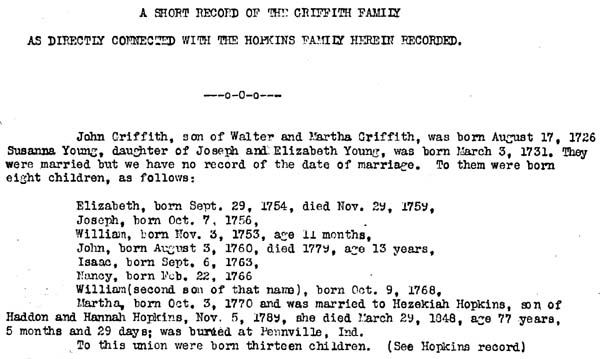 This is a history of the Griffith family descended from Walter Griffith, who married Martha Cox in Christ Church, Philadelphia in 1720. The Griffith family is related to my Hopkins family through the marriage of Martha Griffith, grand-daughter of Walter and Martha, to Hezekiah Hopkins in 1789.
