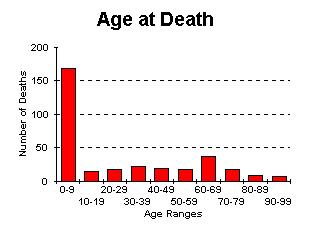 This is a graph of the distribution of ages at death for the people in the sample I transcribed. Note that the infant mortality was very high, while the deaths in the other age ranges were fairly consistent, but with peaks in the 30-39 and 60-69 age ranges.