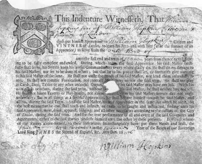 This is the certificate for the apprenticship of William Hopkins the younger to his father, William Hopkins the elder, in the Vintners Company of London. It is the original document, and is signed by William (the apprentice). The date of the certificate is 3 Nov 1686, when William the younger would have been sixteen, a typical age for an apprenticship to begin. William the younger was given the freedom of the city in June 1695 (City Freedom Admission Papers Index, 1681-1700).