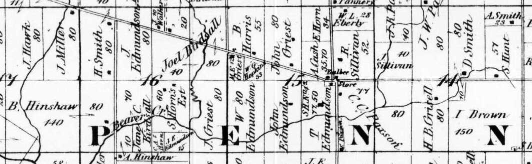 The third source is a map published in 1901 showing land ownership, as in the 1874 map. This map only covers Penn Township. I transcribed the names that were of interest to me, which correspond closely to those found in the earlier map and the deed index. There is also a scanned image (57k) of sections 14-16 of that map for comparison to the one above.